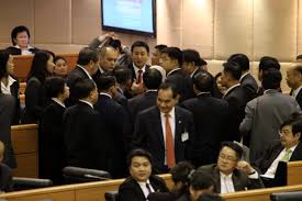 เวลา 04.24 น. กลุ่มส.ส.พรรคประชาธิปัตย์ ตัดสินใจวอล์กเอาต์ เดินออกจาสภาฯ เนื่องจากไม่ได้อภิปราย