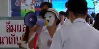ตัวแทนกลุ่มที่เรียกตัวเองว่า "นิสิต ม.เกษตร ร้องไห้หนักมาก" สวมหน้ากากขาวโปรยใบปลิวคัดค้านร่างกฎหมายมหาวิทยาลัยเกษตรศาสตร์ ซึ่งคาดว่าจะนำเข้าสู่การพิจารณาของสภานิติบัญญัติแห่งชาติ(สนช.) ภายในสัปดาห์นี้ พร้อมแจกเอกสารเชิญชวนให้นิสิตคนอื่นๆร่วมกันคัดค้านการนำมหาวิทยาลัยเกษตรศาสตร์ออกนอกระบบ