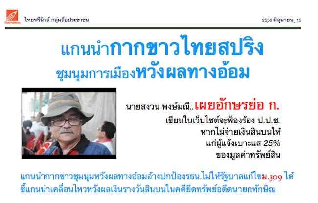 นายสงวน กล่าวว่า การที่นายแก้วสรร ออกมาดำเนินการครั้งนี้เป็นเพราะได้ประโยชน์จากการล้มรัฐบาล เพราะหากรัฐบาลสามารถแก้ไขรัฐธรรมนูญฉบับปัจจุบันได้สำเร็จ โดยเฉพาะ มาตรา 309 ที่ได้รับรองการกระทำในรัฐธรรมนูญฉบับชั่วคราวไว้ นั่นหมายถึง การเป็นคณะกรรมการ คตส.ของนายแก้วสรร เมื่อปี 2549 ที่ดำเนินการตามคำสั่งคณะปฏิรูปการปกครอง โดยมีเป้าหมายยึดทรัพย์สินของ พ.ต.ท.ทักษิณ ชินวัตร อดีตนายกฯ ซึ่งตามระเบียบคณะกรรมการตรวจสอบว่าด้วยการจ่ายสินบนในการดำเนินการเกี่ยวกับทรัพย์สินของคณะกรรมการตรวจสอบการกระทำที่ก่อให้เกิดความเสียหายแก่รัฐ พ.ศ. 2549 ก็ระบุชัดเจนว่า จะให้เงินสินบนแก่ผู้แจ้งเบาะแส ร้อยละ 25 ของมูลค่าทรัพย์สินด้วย ขณะเดียวกันในเว็บไซต์ของคณะกรรมการป้องกันและปราบปรามการทุจริตแห่งชาติ (ป.ป.ช.) เมื่อหลายวันที่ผ่านมา ก็มีอักษรย่อ ก.เขียนในเว็บไซต์ดังกล่าวว่าจะฟ้องร้อง ป.ป.ช.เช่นกันหากไม่จ่ายเงินสินบนให้ตามระเบียบ ซึ่งเป็นเหตุให้นายแก้วสรร ออกมาต่อต้านการแก้ไขรัฐธรรมนูญในทางอ้อม เพื่อปกป้องพฤติกรรมการทำผิดดังกล่าวเอาไว้